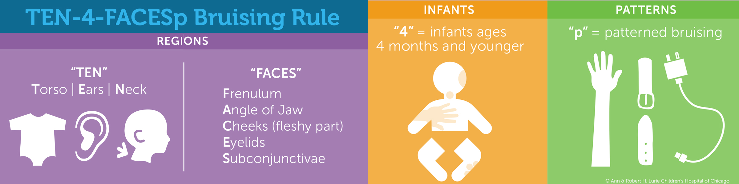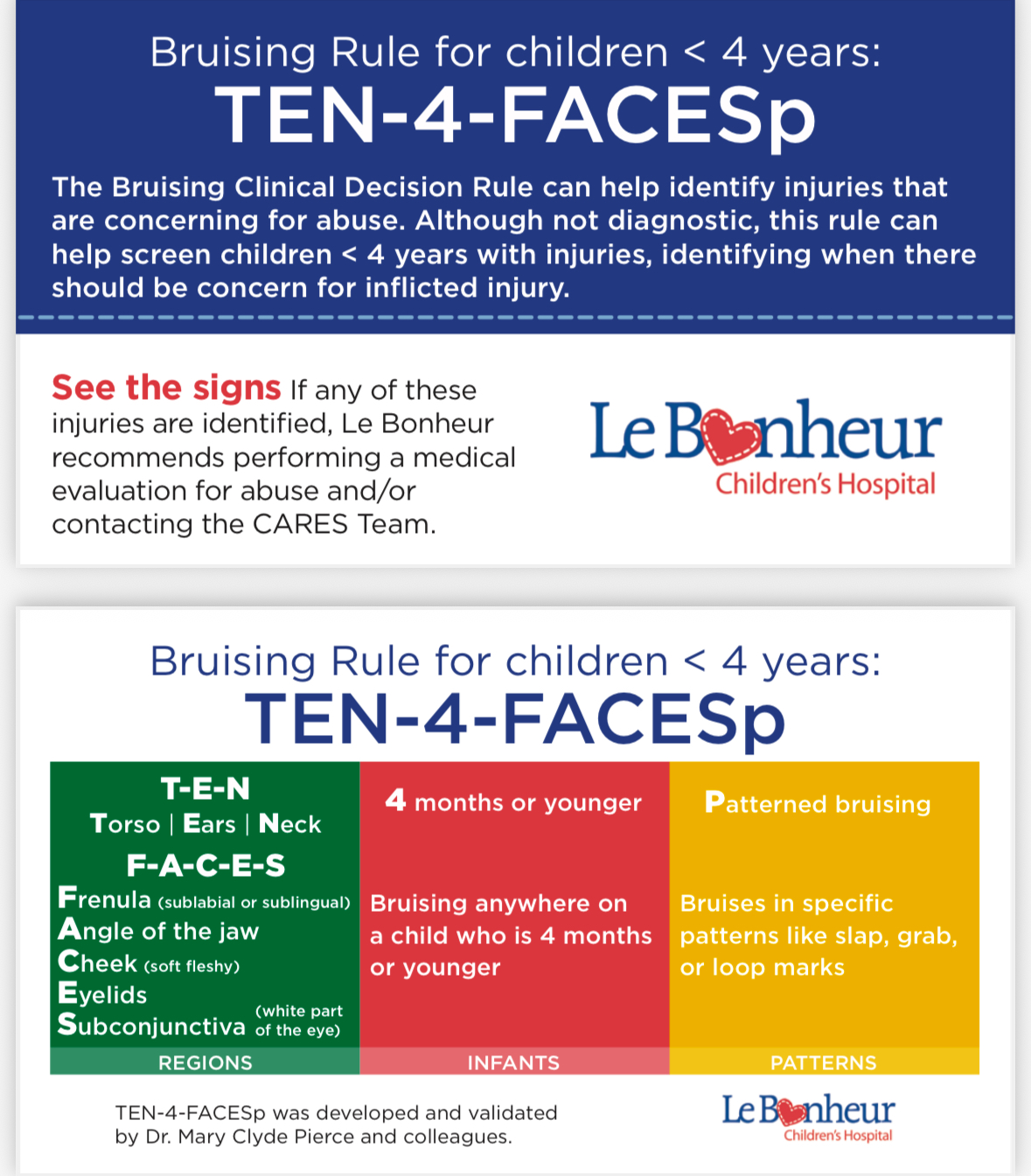 - Melissa Currie, MD, FAAP, the Kosair for Kids Professor and Endowed Chair for Pediatric Forensic Medicine at University of Louisville School of Medicine and board-certified child abuse pediatrician with Norton Children’s Pediatric Protection Specialists, in partnership with the Kosair for Kids Face It Movement created an informational video about the TEN-4-FACESp bruising rule.