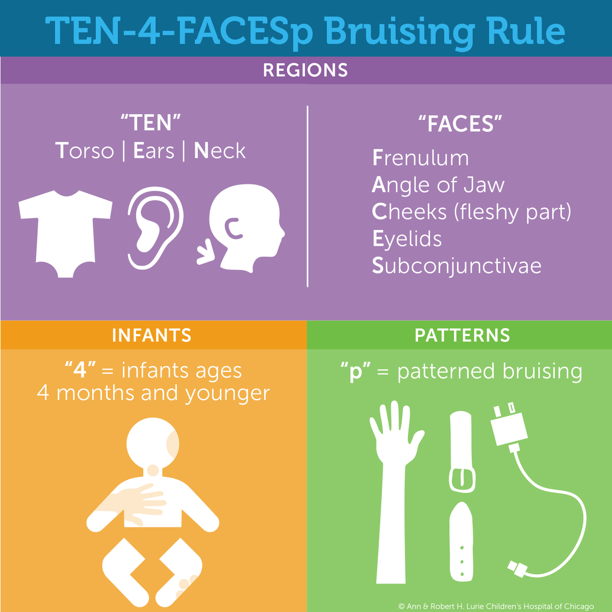 - Missouri Network Against Child Abuse created a graphic recognizing TEN-4 Day and the bruising rule and shared information from Lurie Children’s and the Kosair for Kids Face It Movement.